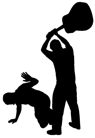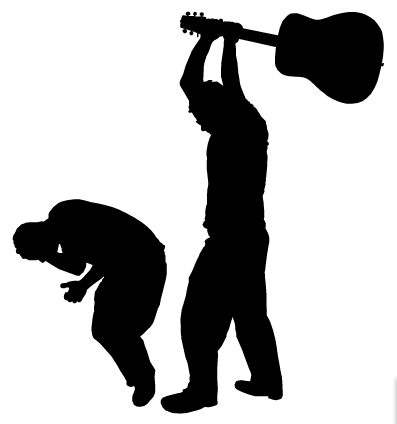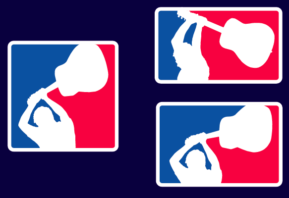 Yeah, when I look at those I see violence and not humor too. I dunno what it is about the line drawings but they're silly. I think it must be the guitarist's pose. Sports logos are great though. (sorry to just echo what's said, but.) On the poster it looks better. Maybe a tagline ("ow") could dilute a perceived message of violence.