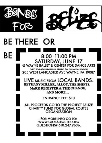 In good old Wayne, PA I'll be playing at a charity concert called Bands For Belize at Wayne Ballet & Center for Dance Arts. It's to raise money to build a school/community center for kids in Belize. There are some really good local bands playing as well.